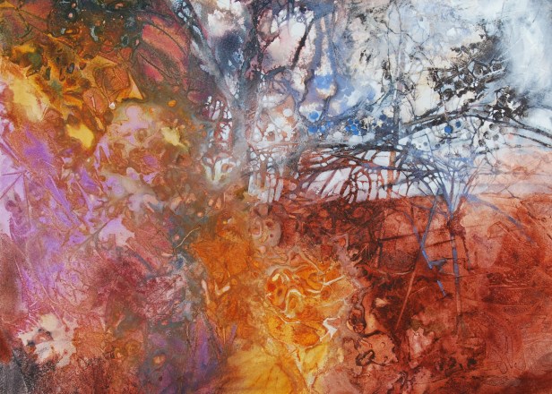 The translucent, unpredictable and fluid quality of this technique is also highlighted in Bob Rudd’s ‘Summer Trees’, revealing a semi-abstract looseness that underlines the dynamism of the subject. Masterful effects are achieved by Ann Blockley as well with ‘Sloes in the Hedge’ and ‘Rose hips in the Hedge’ where the depiction of nature and seasonal changes are interpreted in a poetic way through colours and intricate patterns.