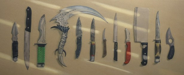 They are renowned artists who have won awards and their works has been extensively exhibited in the UK, around Europe and, in some cases, internationally as well. Some of the paintings show accurate, laborious work rather than an immediate, spontaneous pictorial rendering, similar to the tempera technique, but the luminous effect of watercolour allows unique results. This is clear in the work of Lillias August who layers and lifts washes in order to obtain the right effect, which is perfectly executed in her display of pieces of guns and of knives (‘Decommissioned’ and ‘Amnesty’). In a similar way, the real world has inspired artists such as Harry Price, Paul Banning and Ian Sidaway who return to visit the subject and record it with photos. Later they work in their studios in a recollection of memories that is also a reworking of the imagination. The results are captivating, accurate and loose at the same time, with a skilful rendering of the transparency typical of the watercolour medium.