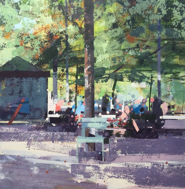 Other remarkable examples are Chris Forsey’s ‘Along the Causeway, St Michael’s Mount’, Robin Hazlewood’s ‘The Chair, Luxembourg Gardens’, Colin Allbrook’s ‘Morning on the river’ and Roger Dellar’s ‘Late Night Tango’. They all use mixed media, experimenting with watercolour, gouache and bodycolour with surprising distinctive effects.