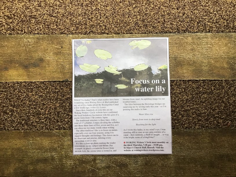 Woking Writers Circle’s longest-serving member Liz Lennie has been making waves in our local newspaper, the Woking News and Mail, with her haiku inspired by our local waterway. Following the publication of Liz’s five haiku about her lockdown walks along the Basingstoke canal near her home in St John’s, the newspaper republished them on its Letters page. It has now gone further and published an article by Liz about haiku in its 29 June edition, also on its Letter page. This is Liz’s article, headed ‘Focus on a water lily’: