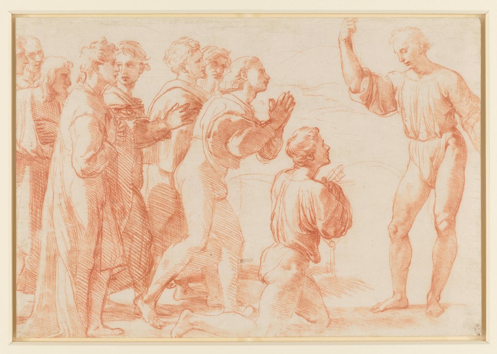 Two studies of the tapestry cartoons that are displayed in the exhibition and that are dated 1514 reveal the master’s methodology in working on preparatory drawings for his major works. He started from the positioning of the figures, which were probably taken from life drawings. The sketches correspond to the cartoons on a smaller scale, which gives us a clear idea of Raphael’s detailed planning and accurate composition. The drawings are produced using sophisticated techniques that include pen and iron-gall ink as well as red chalk over lines made with a stylus. This shows that Raphael considered these drawings to be complete works and important references for his cartoons and therefore for the tapestries.