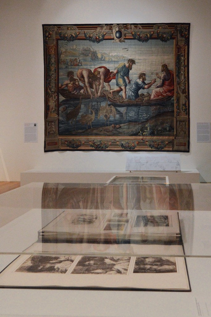 The interesting works on display consistently focus on two main works by Raphael: ‘Christ’s Charge to Peter’ and ‘The Miraculous Draught of Fishes’ from Raphael’s series of cartoon designs for Pope Leo X commissioned for the lower walls of the Sistine Chapel in Rome. James I and Charles I bought seven of Raphael’s cartoons. The tapestry of ‘The Miraculous Draught of Fishes’ on display was produced by the Mortlake Tapestry Manufactory in the 17th century. The work describes the miracle reported in Luke, Chapter 5, verses 1–10 and features two linked scenes: the apostles as ‘fishers of men’ and Peter and Andrew before Christ. The ships, symbolising the Church, are full of fish, that is, of saved souls. The setting is idyllic sea scenery and yet the picture is dynamic because of the dramatic gesture of Andrew’s open arms and Peter humbly kneeling in front of Christ in the foreground. Although the apostles were unaware of their mission, they show, at the same time, their devotion to Christ.