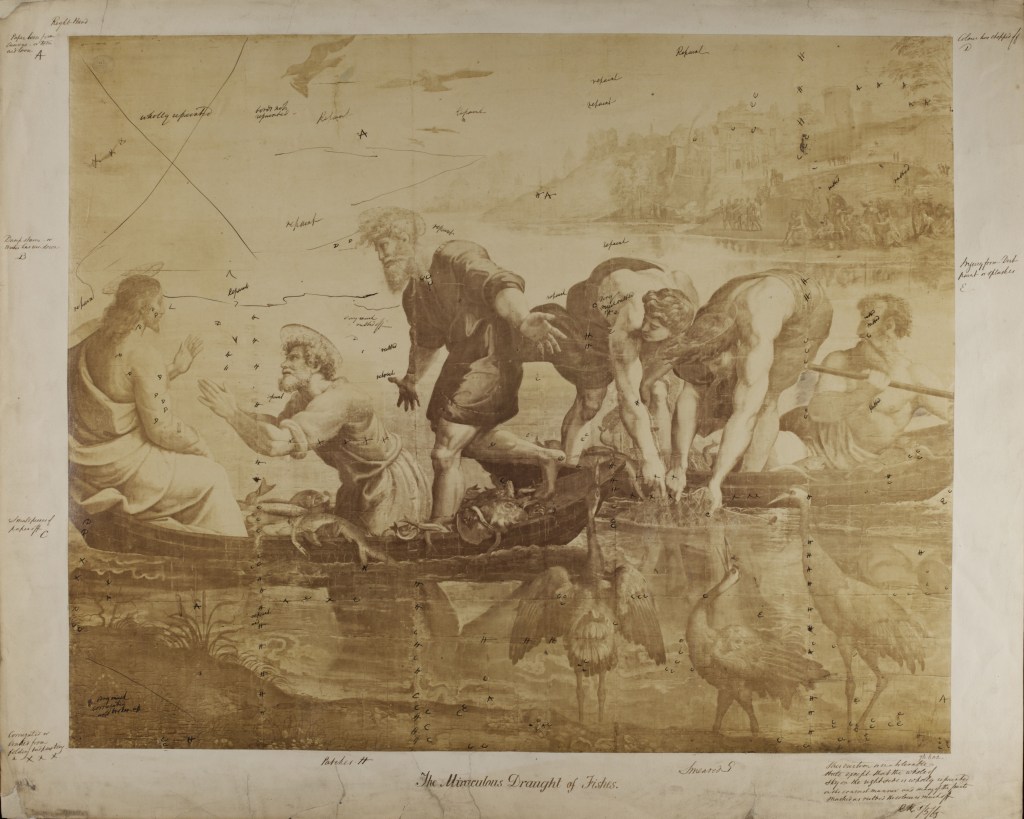 Prince Albert sent some of the reproductions to European royal households, private collections, museum curators and church authorities in order to promote his project, hoping that he would be allowed to make more copies of Raphael’s works around Europe. The different kinds of reproductions on display show different levels of the two main works under focus. At times they concentrate on specific details, which convey their dramatic characteristics, such as in the figure of St Andrew reproduced in print by Thompson or in the three apostles in the form of an albumen print attributed to Leonilda Caldesi.