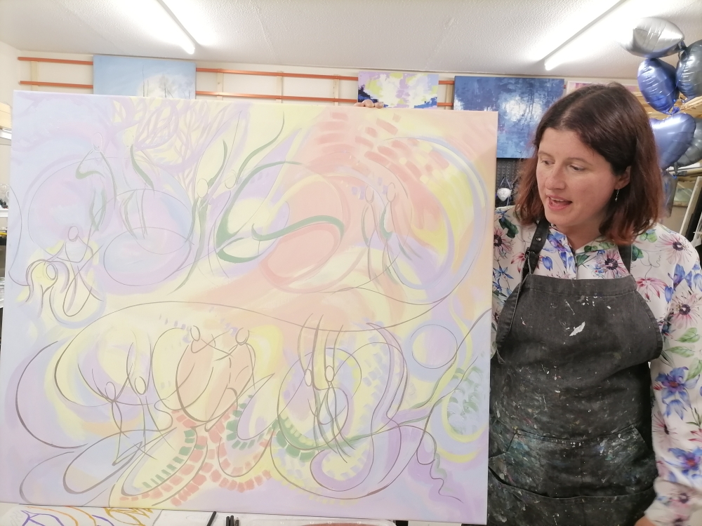 I took part in the inspiring workshops led by Hannah Bruce, pictured below, at her studio last May. We made some paintings following the prompt of the mesmerising music from which the project started. Its revealing lyrics and soothing melody are a never-ending source of inspiration. We all created good original work, mostly free and loose abstract pieces. The dance we watched was inspiring too and it gave us more ideas for our drawings. I particularly admired Hannah Bruce’s picture that merged melody, dance and the rhythm of the piece of music in soft colours and strong marks. An impressive piece that explored the creative potential of this stimulating project. Here is the link to the video