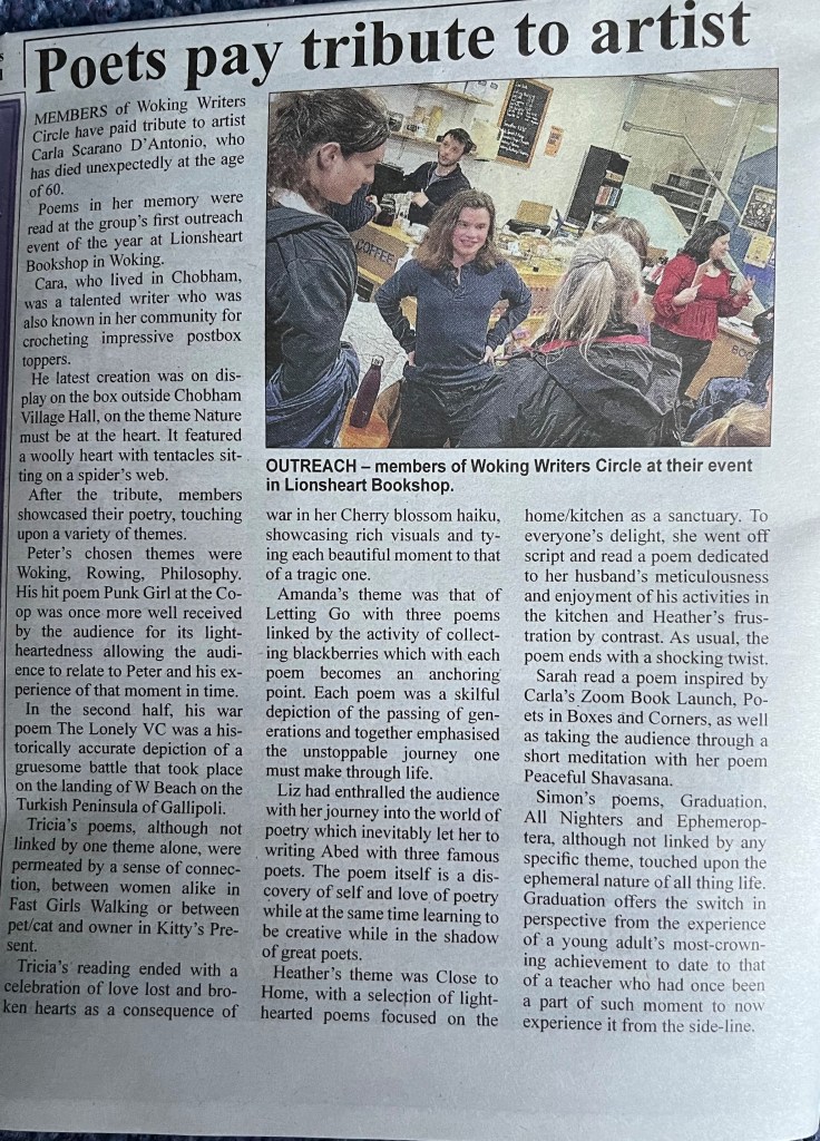 WWC’s first outreach event of the year took place at the Lionsheart Bookshop in Woking on Wednesday, 16 March. The Circle’s members showcased their wonderfully skilful poetry touching upon a variety of themes. Tributes were paid to our dear friend Carla, who we will miss very dearly, in the form of a select few poems being read by the members.
